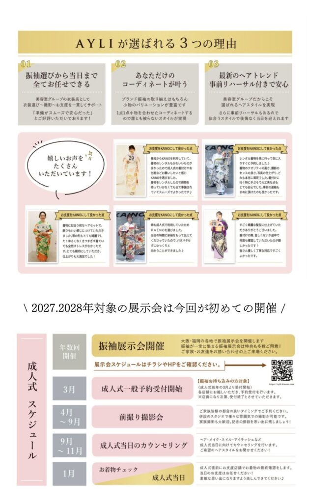 アイリーではKAINO美容室のグループとして約20年。南大阪、福岡志免を中心に成人式をお手伝いしております。当店でお支度を受けることができるのは毎年100組ほどのお客様のみ。着付けやヘアメイクの試験を通過したスタイリストだけがお支度を担当します。そして当店では毎年多くの新作を揃えるだけでなく、1点1点小物を選べることにより、あなただけの特別なコーディネートが高いクオリティで実現!そのため地域でのご紹介やきょうだいでのリピートも多く、とても好評いただいております。人気の衣装もたくさん選べる今がチャンス!ぜひたくさんの選択肢に会いに来てください!